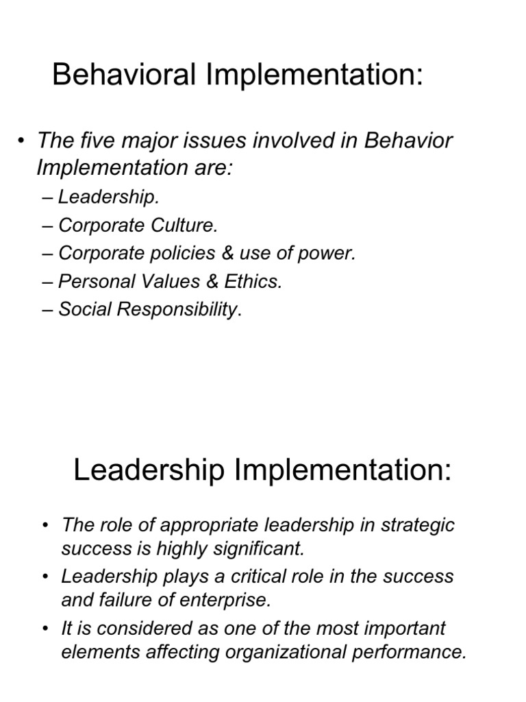 The behavioral of the employees affect the success of the organization. The successful implementation of strategy takes more time than its formulation. Strategic Initiatives arent scoped well punctuated with long duration unrealistic goals Too many strategic initiatives run concurrently leading to strategic fatigue Most strategic initiatives bet on the same best guys around leading naturally to under performance.